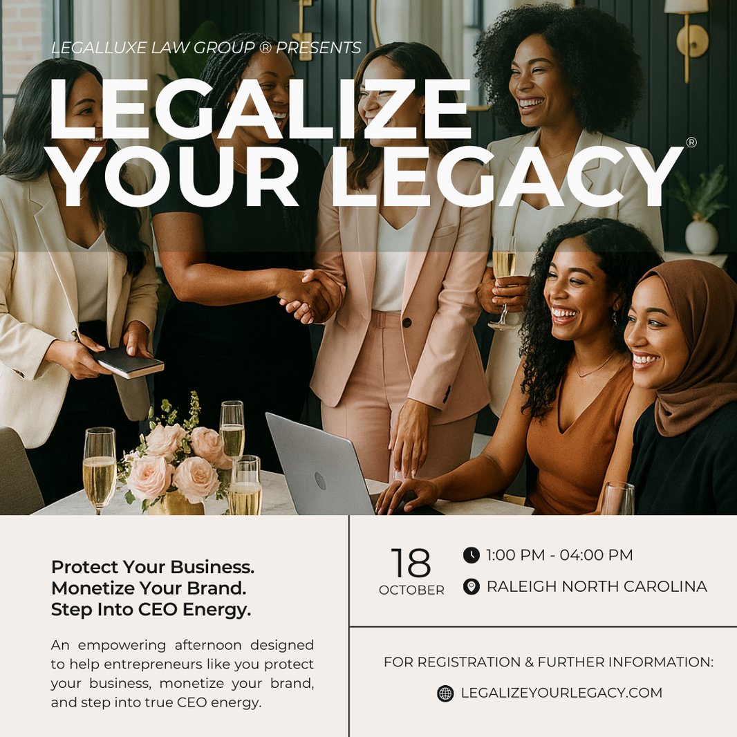 LegalLuxe Law Group® is a locally based, minority woman-owned law firm with Southern roots and nationwide reach. GLAM Legal® is our education arm—making legal protection accessible, practical, and powerful for entrepreneurs.